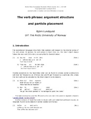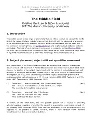 (Journal article; Tidsskriftartikkel; Peer reviewed, 2017-08-22)This section covers a wide range of phenomena that are related to what we can call the middle field of the clause. We have included chapters that deal both with the placement of arguments in the middle field (excluding argument structure inside the verb phrase, which is dealt with in the section on the verb phrase, see Lundquist 2014a), and chapters about auxiliaries and verbmorphology. The topic ... -