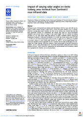 (Journal article; Tidsskriftartikkel; Peer reviewed, 2024-11-18)Icebergs are part of the glacial mass balance and they interact with the ocean and with sea ice. Optical satellite remote sensing is often used to retrieve the above-waterline area of icebergs. However, varying solar angles introduce an error to the iceberg area retrieval that had not been quantified. Herein, we approximate the iceberg area error for top-of-atmosphere Sentinel-2 near-infrared data ... -