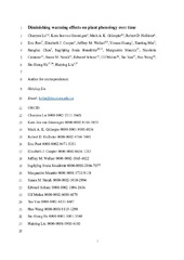 (Journal article; Tidsskriftartikkel; Peer reviewed, 2024-08-05)<ul> <li>Plant phenology, the timing of recurrent biological events, shows key and complex response to climate warming, with consequences for ecosystem functions and services. A key challenge for predicting plant phenology under future climates is to determine whether the phenological changes will persist with more intensive and long-term warming.</li> <li>Here, we conducted a meta-analysis of ... -