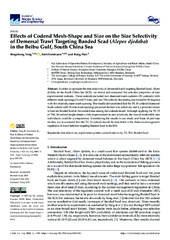 (Journal article; Tidsskriftartikkel; Peer reviewed, 2023-07-09)In order to optimize the size selectivity of demersal trawl targeting Banded Scad, Alepes djedaba, in the South China Sea (SCS), we tested and compared the selective properties of four experimental codends. These codends included two diamond-mesh codends (T0 codends) with different mesh openings (30 and 35 mm), and two T90 codends (the netting was turned by 90 degrees) with the relatively same ... -
